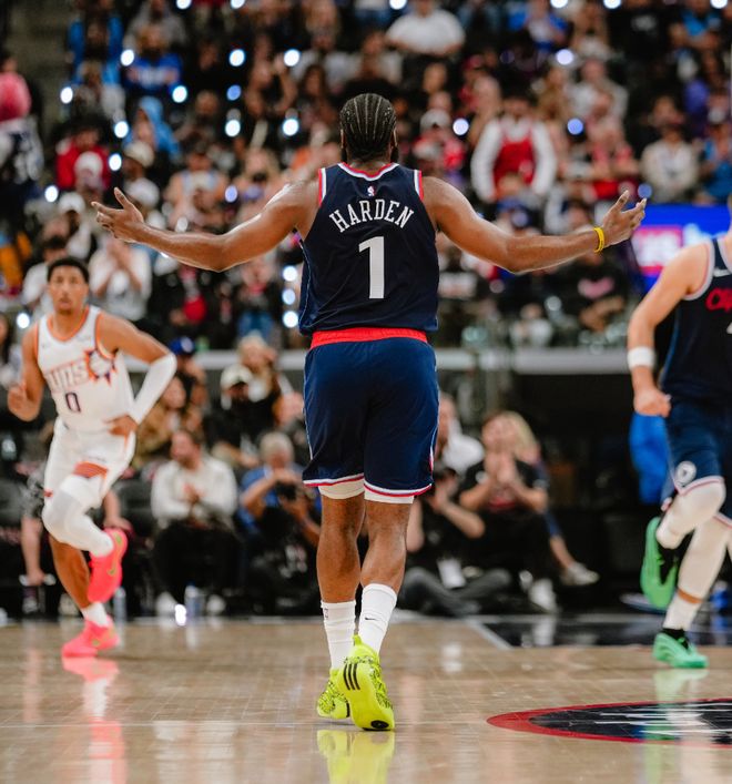 次节哈登从地上捡起来球立马三分出手都命中,单节哈登又命中三记三分球,第二节6分钟里连拿12分,上半场打完哈登8中7+三分5中5+罚球7中7拿到26分,在哈登的带领下快船大比分领先太阳。
